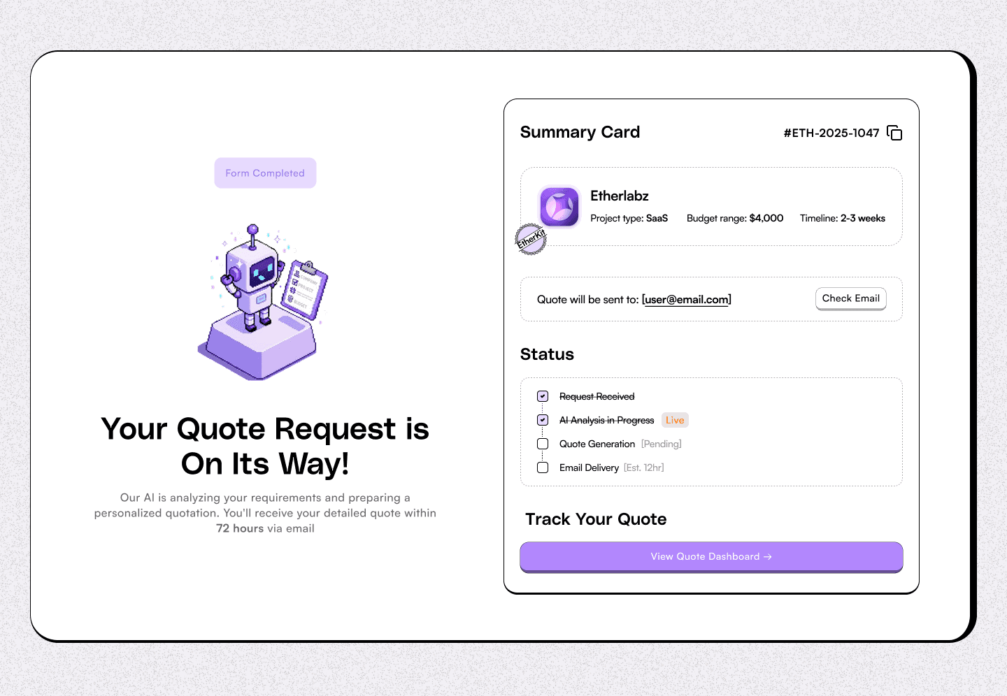 A “Track Your Quote” button lets users follow updates anytime, ensuring transparency throughout.