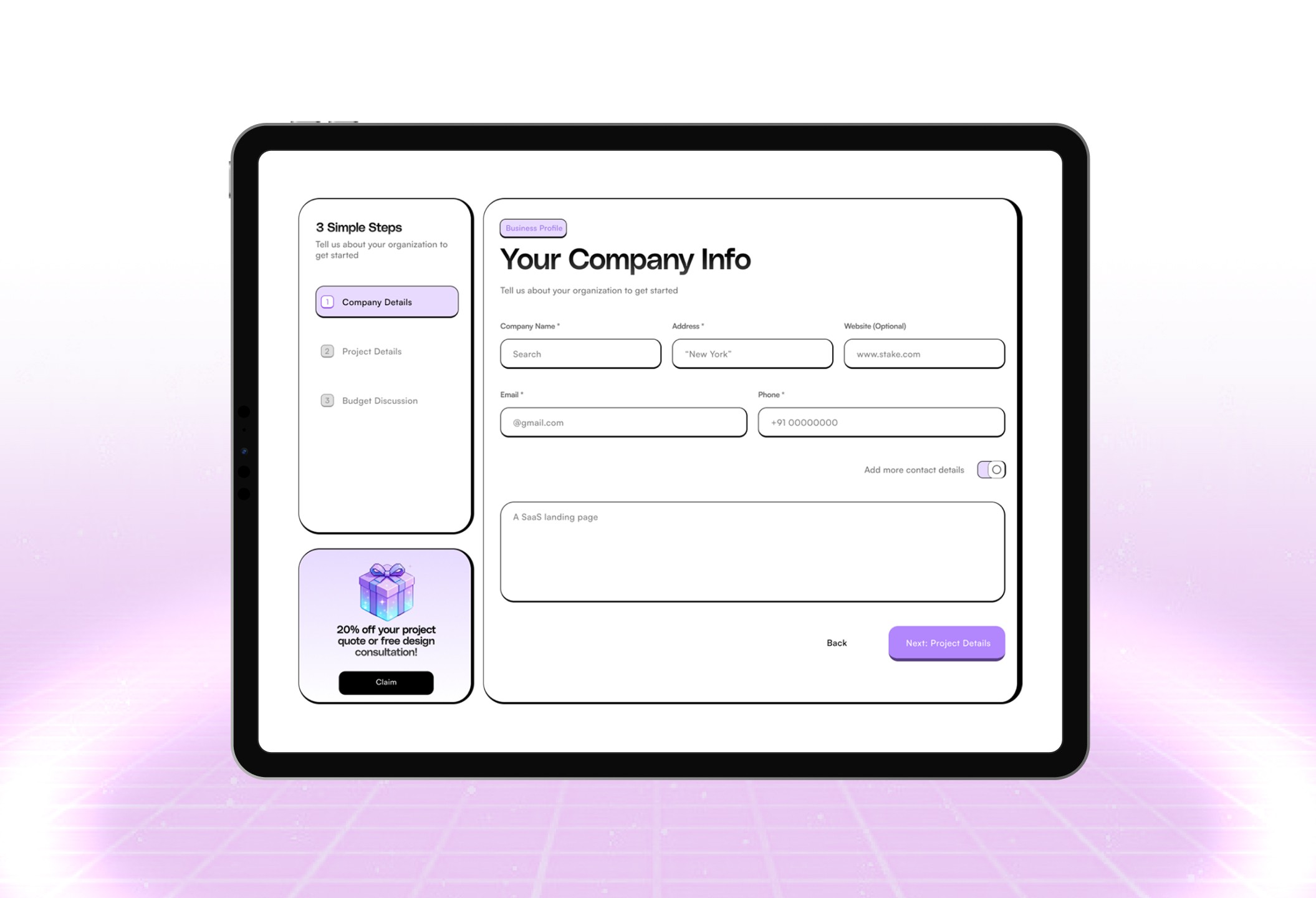 We rebuilt the experience from the ground up, transforming a clunky form into a streamlined, interactive multi-step flow. Each section feels light and welcoming, guiding users with feedback and progress cues.