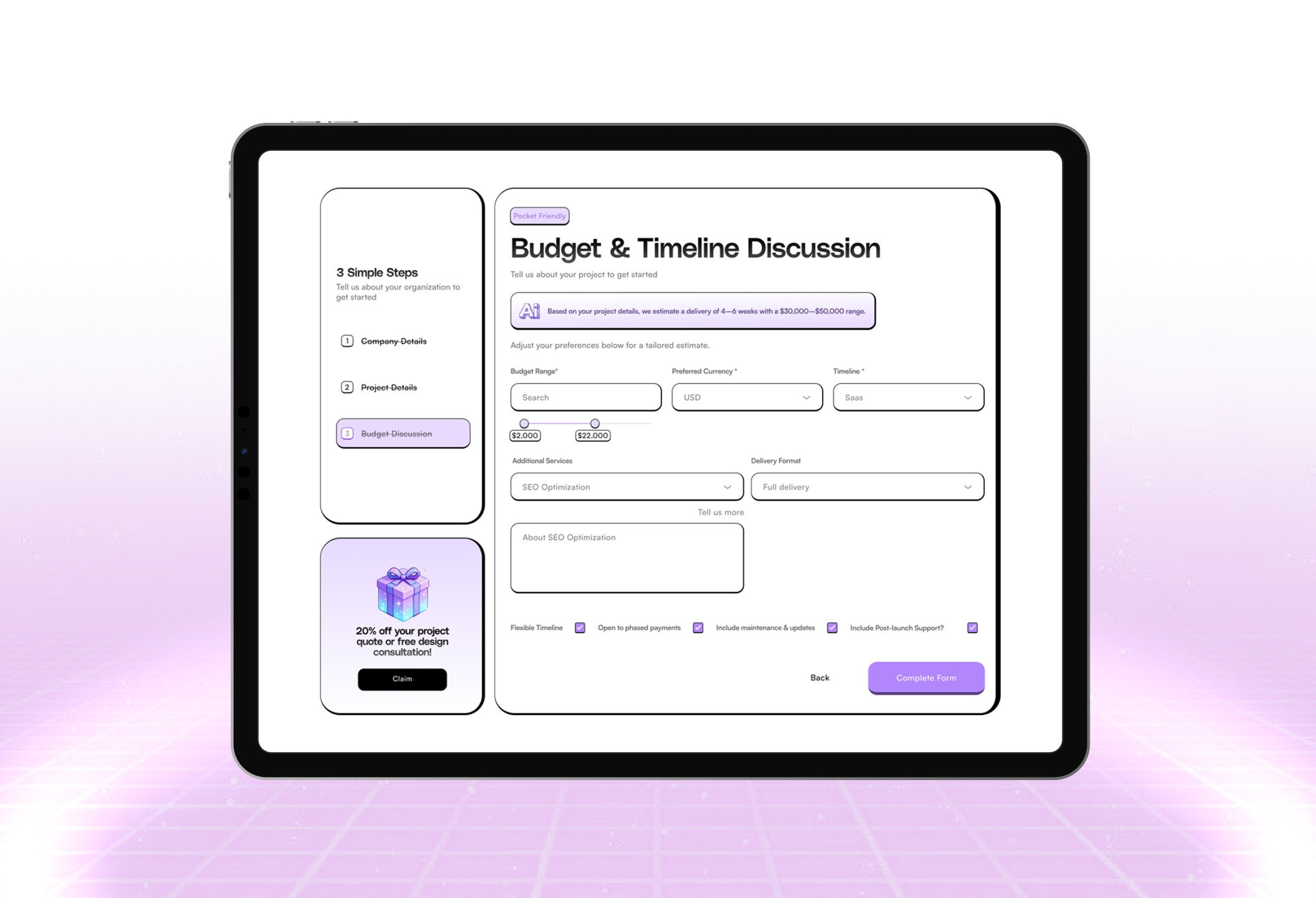 Users can set budget preferences and delivery timelines, while instantly seeing a smart AI estimate based on their project info.